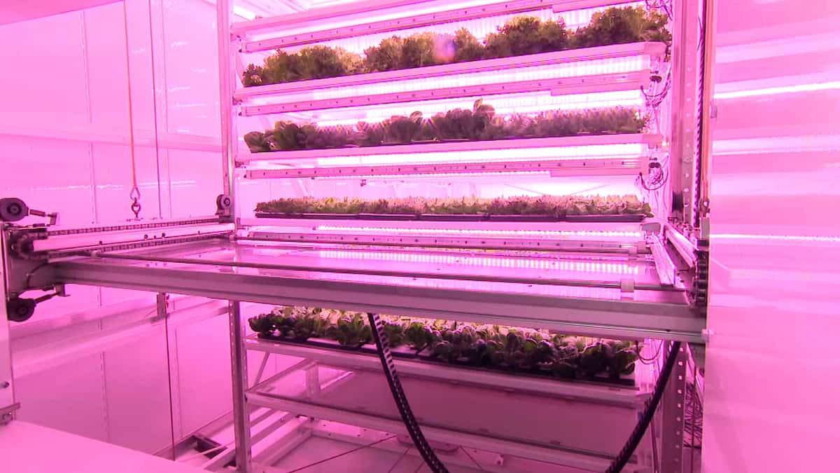 Le système constitué de 20 étages superposés permet de gagner de la superficie. De plus, le tout fonctionne avec seulement deux moteurs permettant de faire bouger 300 mètres carrés de culture.