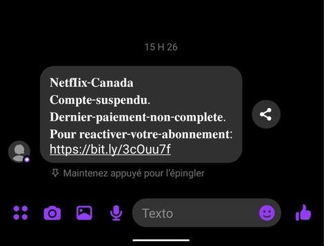 Dans ce cas-ci, les arnaqueurs tentent de se faire passer pour des représentants de Netflix Canada et vous mentionnent que votre compte a été suspendu en raison d’un défaut de paiement.
