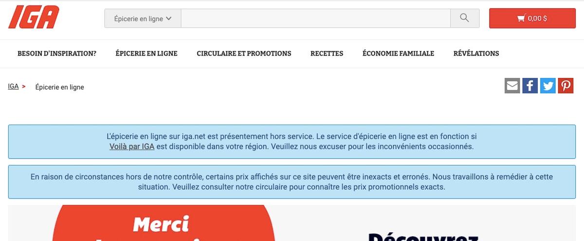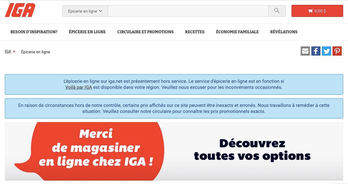 Sur la même page, on explique qu'Épicerie en ligne sur iga.net est hors service, mais que le service d'épicerie en ligne «Voilà par IGA» fonctionne et peut être utilisé s'il est disponible dans la région du client.